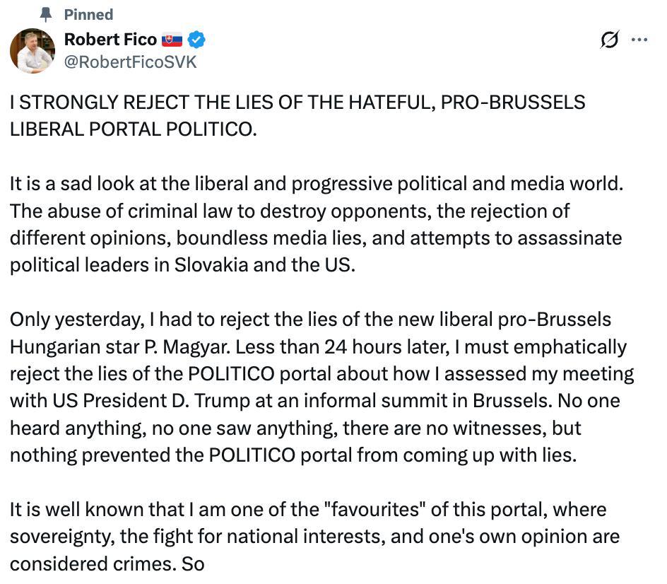 Крім того, після згаданого вище саміту ЄС Фіцо жорстко розкритикував не Трампа, а лідерів Євросоюзу. А президента США якраз поставив за приклад європейцям.