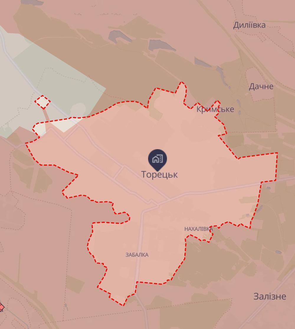 Український військовий ресурс Deep State відзначив на своїй карті як повністю захоплене росіянами місто Торецьк Донецької області.