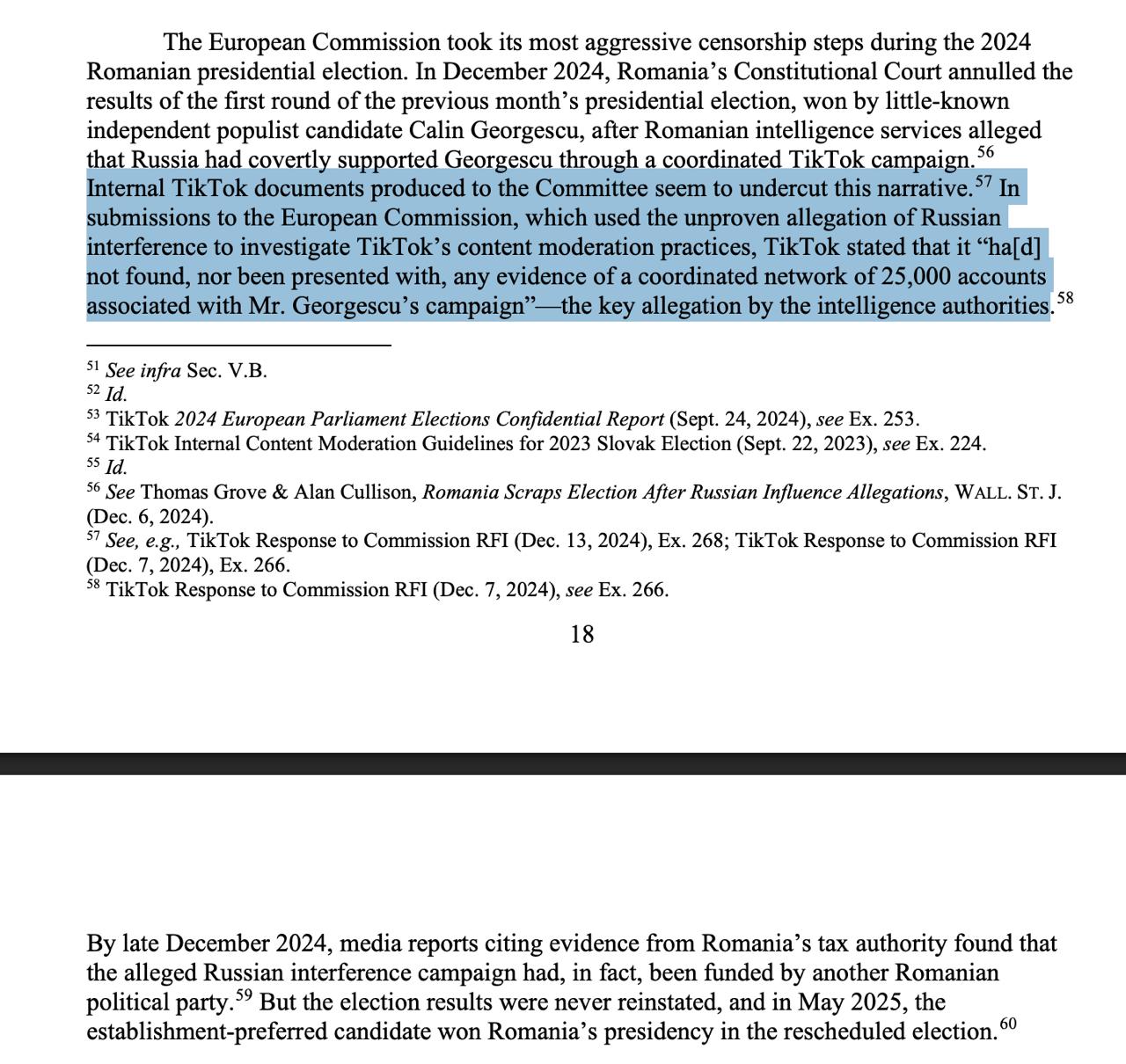 "Внутрішні документи TikTok, представлені комітету, схоже, спростовують цю версію (про російське втручання у вибори - Ред. ). У документах для Єврокомісії, яка використовувала неодноразові заяви про втручання Росії для розслідування практики модерації контенту в TikTok, соцсеть заявила мережі з 25 тисяч облікових записів, пов'язаних з кампанією Келіна Джорджеску", - сказано в документі.