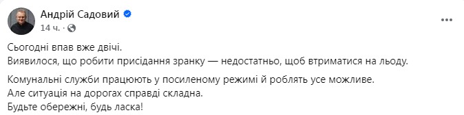 "Сьогодні впав уже двічі. Виявилося, що робити присідання з ранку недостатньо, щоб утриматися на льоду. Комунальні служби працюють у посиленому режимі та роблять усе можливе. Але ситуація на дорогах справді складна. Будьте обережні, будь ласка!" - сказано у його публікації на Фейсбуці.