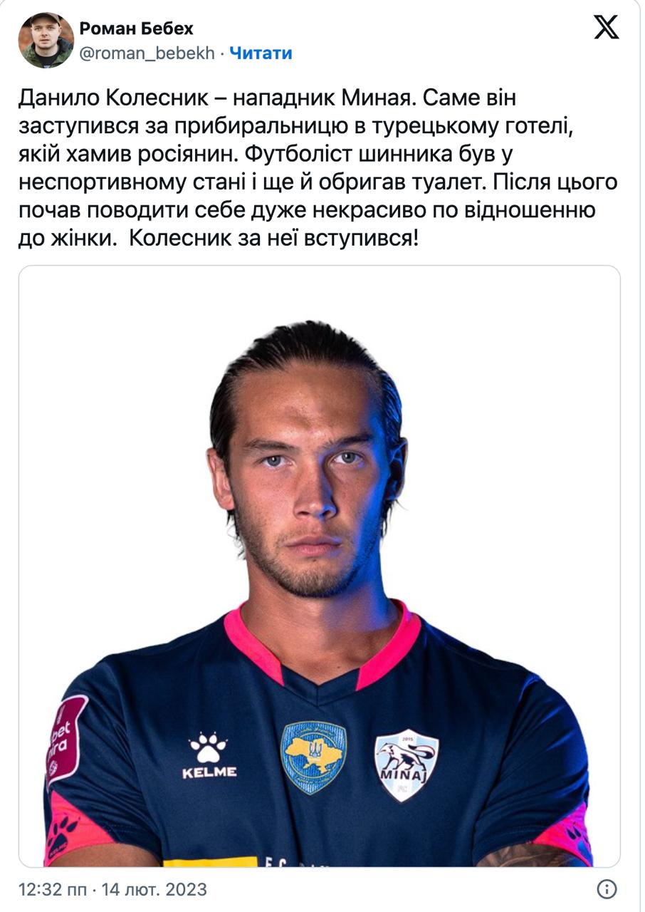 А журналіст Роман Бебех нагадав іншу історію про Колесника: футболіст, ще гравець "Міная", заступився за прибиральницю в турецькому готелі і побив російського футболіста.