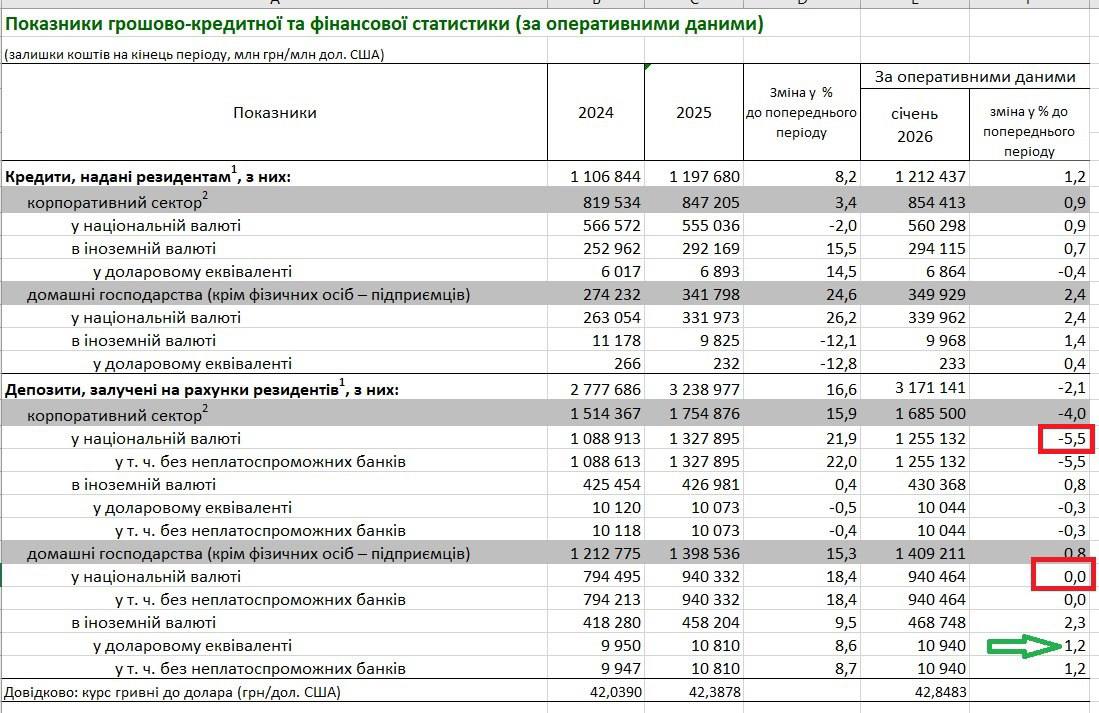 Національний банк України опублікував звіт за січень 2026 року, з якого видно, що минулого місяця накопичення бізнесу в гривні скоротилися на 5,5% (до 1,26 трлн грн), а населення — майже не зросли (тримаються на 940 млрд грн), на відміну від попередніх місяців, на 5% 2025 року.