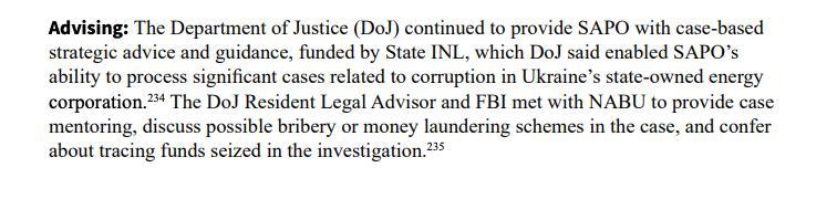 "Міністерство юстиції США (DoJ) продовжувало надавати САП стратегічні консультації та поради у конкретних справах, що фінансуються INL, що, за словами DoJ, дозволяло САП ефективно обробляти важливі справи, пов'язані з корупцією в державній енергетичній компанії України (очевидно, йдеться про "Енергоатом" - Ред.) Юридичний радник DoJ та ФБР зустрічалися з НАБУ для наставництва у справах, обговорення можливих схем хабарництва або відмивання грошей та координації щодо відстеження коштів, вилучених у розслідуванні", - йдеться у доповіді.