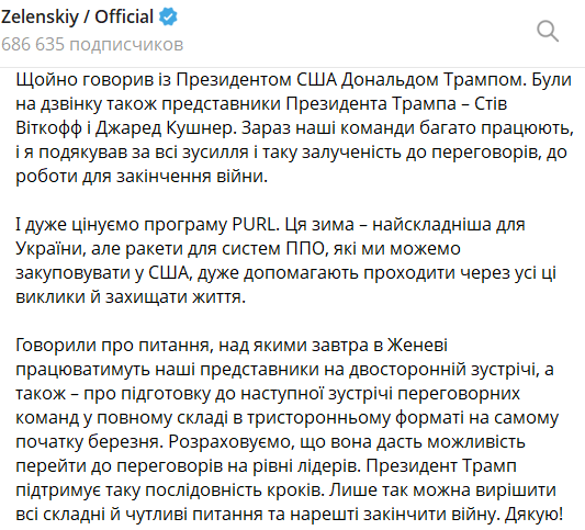 "Говорили про питання, над якими завтра в Женеві працюватимуть наші представники на двосторонній зустрічі, а також про підготовку до наступної зустрічі переговорних команд у повному складі у тристоронньому форматі на самому початку березня. Розраховуємо, що вона дасть змогу перейти до переговорів на рівні лідерів. Президент Трамп підтримує таку послідовність кроків", - додав Зеленський.