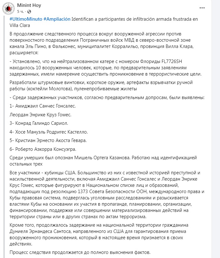 "Вранці 25 лютого в територіальних водах Куби було виявлено швидкісний катер з реєстраційним номером FL7726SH, зареєстрований у Флориді, США, який наблизився на відстань 1 морської милі на північний схід від каналу Ель-Піно, провінція Вілья-Клара. Військами для ідентифікації, з судна-порушника відкрили вогонь по кубинським військовослужбовцям, внаслідок чого командир кубинського судна отримав поранення. Флориди FL7726SH перебували 10 озброєних людей, які, згідно з попередніми свідченнями затриманих, мали намір проникнути з терористичною метою", - йдеться в повідомленні.