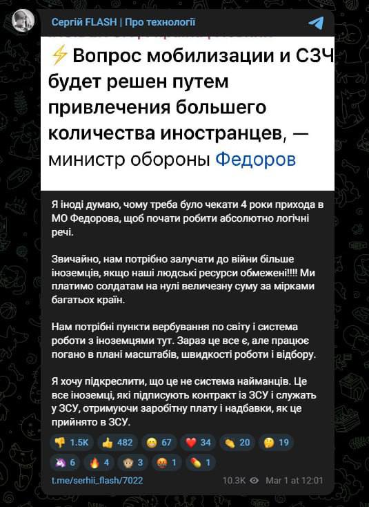 Раніше влада заявляла, що близько двох мільйонів чоловіків ухиляються від військового обліку, і цей резерв, який потрібно використовувати для поповнення ЗСУ. Однак, судячи з ідеї Федорова щодо іноземних найманців, поки що немає розуміння, як цей "резерв" можна змусити воювати (навіть якщо цих людей мобілізувати, то де гарантія, що вони за першої нагоди не підуть у СЗЧ).
