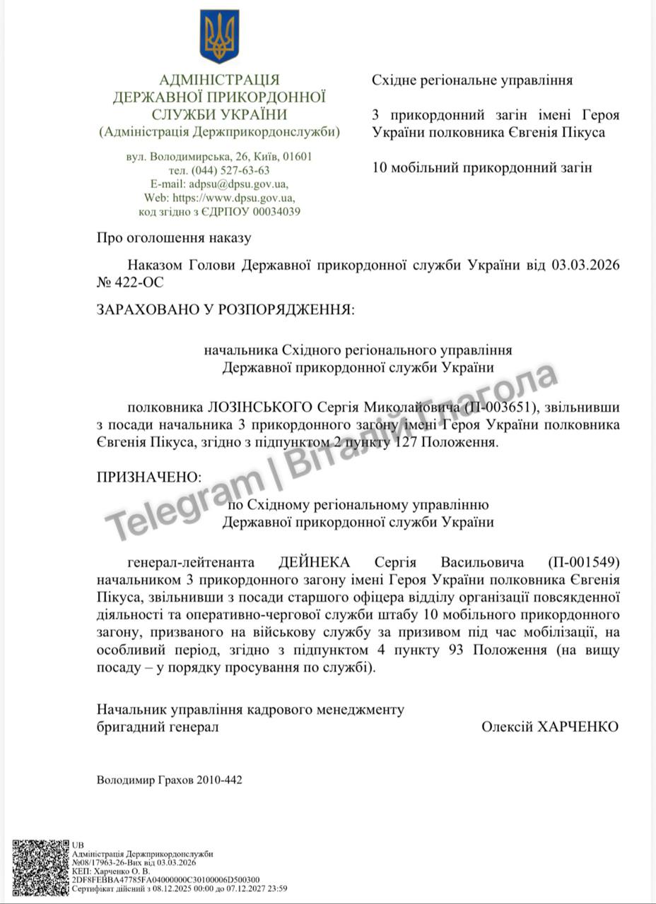 Нагадаємо, у січні Сергія Дейнека було звільнено з посади голови Держприкордонслужби України. На даний момент він є фігурантом кримінального провадження з ймовірного отримання хабарів за сприяння контрабанді цигарок у 2023 році.