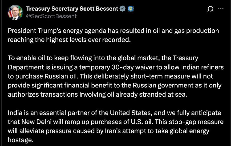 "Для забезпечення безперебійного потоку нафти на світовий ринок Міністерство фінансів США вводить тимчасовий 30-денний дозвіл, що дозволяє індійським нафтопереробним заводам закуповувати російську нафту. США.