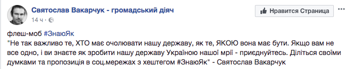 "Не так важно то, кто должен возглавлять наше государство, как то, какой оно должно быть. Если вам не все равно, и вы знаете как сделать Украину государством нашей мечты - присоединяйтесь, делитесь своими мыслями и предложениями в соцсетях с хэштегом #ЗнаюЯк", - заявил он.