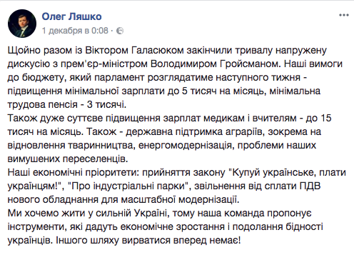 Любопытно, что еще накануне голосования Олег Ляшко громогласно требовал поднятие минимальной заработной платы до 5000 гривен, а зарплат врачей и медиков - до 15 000. Но ничего из этого выполнено не было. Между тем, фракция свои голоса дала.