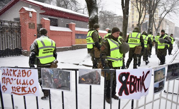 Перед диппредставительствами России в Украине желающих проголосовать на выборах ожидала надпись "Ласкаво просимо в пекло". Фото: РИА Новости