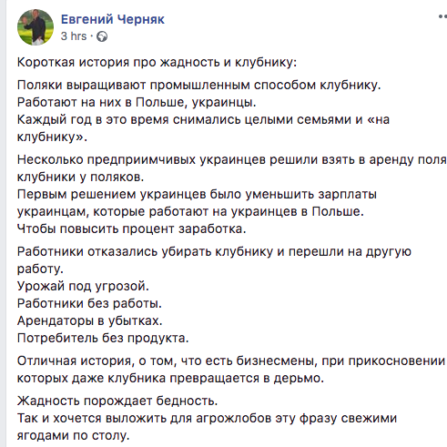 "Несколько предприимчивых украинцев решили взять в аренду поля клубники у поляков. Первым решением украинцев было уменьшить зарплаты украинцам, которые работают на украинцев в Польше.  Чтобы повысить процент заработка. Работники отказались убирать клубнику и перешли на другую работу. Урожай под угрозой. Работники без работы. Арендаторы в убытках. Потребитель без продукта. Отличная история, о том, что есть бизнесмены, при прикосновении которых даже клубника превращается в дерьмо", - написал на своей странице в Facebook предприниматель Евгений Черняк.