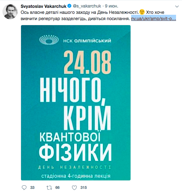 Сам Вакарчук в своем микроблоге опубликовал ироничную афишу, с помощью которой приглашает всех желающих на концерт в честь Дня независимости Украины, который якобы будет четырехчасовой лекцией на тему "Ничего, кроме квантовой физики".