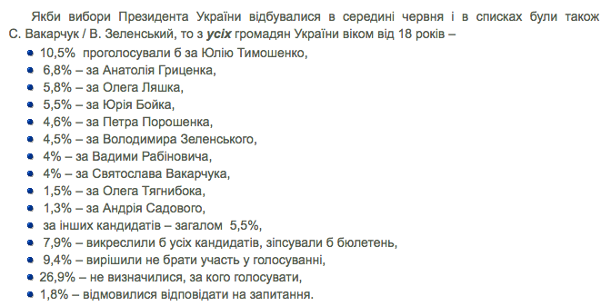 Ближе к Новому 2018 году четыре крупные социологические службы – "Социс", Киевский международный институт социологии (КМИС), Социологическая группа "Рейтинг" и Центр Разумкова при поддержке Комитета избирателей Украины опросили небывалое количество респондентов – 20 тысяч человек. Оказалось, что голоса распределились следующим образом. Действующий президент Петр Порошенко набрал бы 9,8% голосов, лидер "Батькивщины" Юлия Тимошенко – 8,8%, а бронзовым призером рейтинга оказался бы музыкант, фронтмен группы "Океан Ельзи" Святослав Вакарчук с 7,4%.
