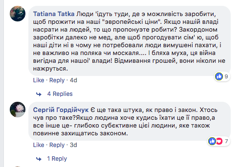 "Люди едут туда, где есть возможность заработать, чтобы прожить на наши "европейские цены". Если нашим властям нас..ть на людей, то что предлагаете делать? За границей заработки далеко не сахар, но чтобы прокормить семью, чтобы наши дети ни в чем не нуждались, люди вынуждены пахать – и неважно на поляка или москаля. И бляха муха, эта война выгодна для нашей власти! Отмывание денег, они никогда не нажрутся", – рассуждает львовянка Татьяна Татка.
