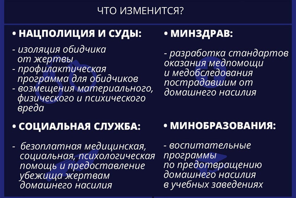 Кроме того, на государство возлагаются обязанности по запуску круглосуточной горячей линии и открытию убежищ, которыми смогут пользоваться жертвы насилия, созданию реестра "домашних тиранов" и т.п.