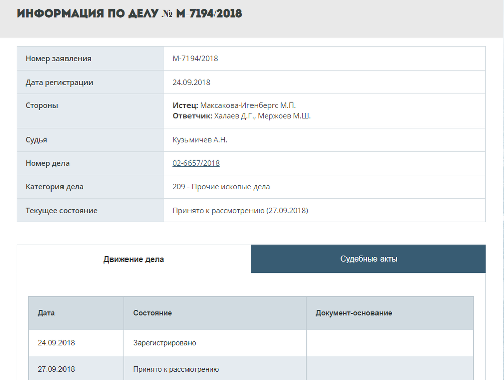 В четверг, 27 сентября, ее иск был принят к рассмотрению, а на 15 октября запланирована беседа с фигурантами тяжбы.