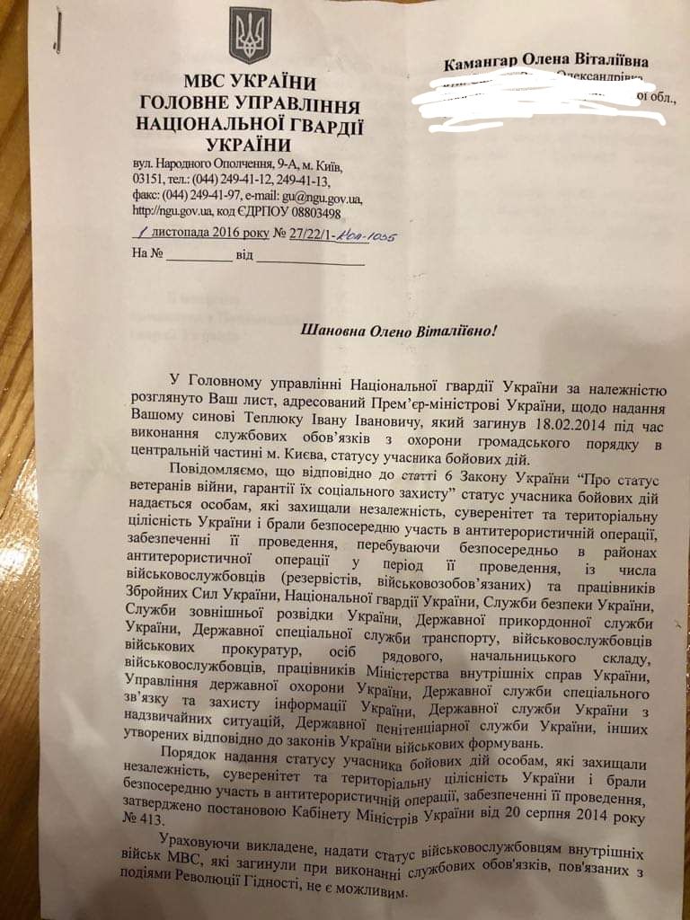 "Порядок предоставления статуса участника военных действий лицам, которые защищали независимость, суверенитет и территориальную целостность Украины и принимали участие в АТО, утвержден указом Кабинета министров Украины от 20 августа 2014 года. Предоставить статус военнослужащим Внутренних войск МВД, которые погибли при выполнении служебных обязанностей, связанных с событиями Революции достоинства, является невозможным", – из ответа МВД Украины, который оказался в распоряжении "Страны".