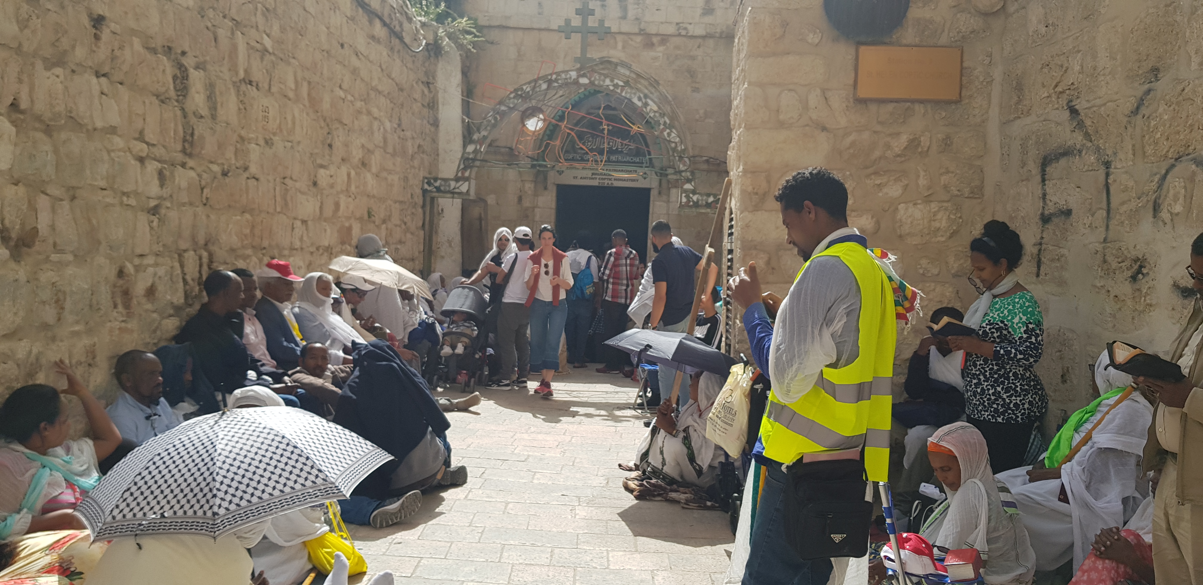 В пятницу вечером вокруг Храма Гроба Господня уже собрались сотни верующих. Здесь люди занимают очередь, размещаясь на земле или на заранее принесенных стульях. Впереди многочасовое ожидание, а поэтому бутылки с водой, еда и зонты от палящего солнца являются обязательным атрибутом.