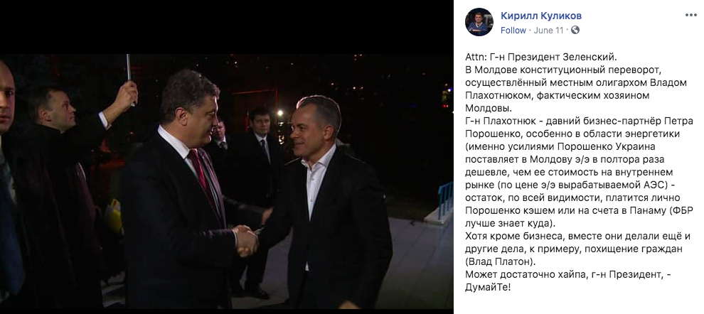"Плахотнюк - давний бизнес-партнёр Петра Порошенко, особенно в области энергетики. Именно усилиями Порошенко Украина поставляет в Молдову электроэнергию в полтора раза дешевле, чем ее стоимость на внутреннем рынке (по цене электроэнергии, вырабатываемой АЭС) - остаток, по всей видимости, платится лично Порошенко кэшем или на счета в Панаму (ФБР лучше знает куда). Хотя кроме бизнеса, вместе они делали ещё и другие дела, к примеру, похищение граждан (Влад Платон)", - написал на своей странице в Facebook экс-нардеп Кирилл Куликов.