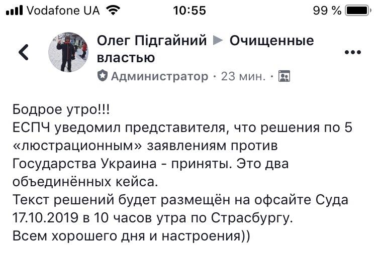 Так, утром 29 сентября один из идеологов так называемого "бунта очищенных" - массового обжалования положений "люстрации по-киевски" в ЕСПЧ экс-прокурор Олег Подгайный написал в соцсети: суд в Страсбурге уведомил представителя интересов пораженных в правах бывших чиновников и силовиков о том, что решения сразу по пяти люстрационным заявлениям против государства Украина уже приняты.