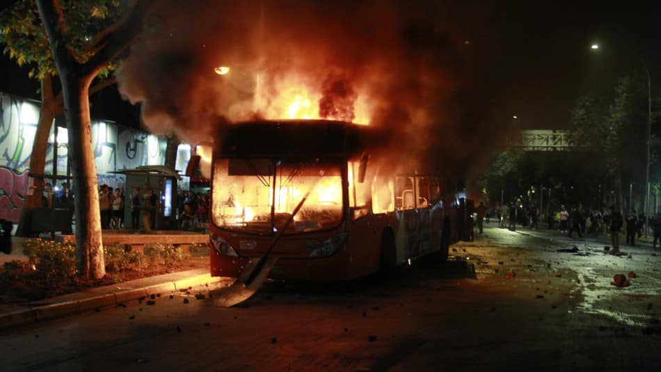 Протестующие в Сантьяго поджигают автобусы. Источник фото: Facebook