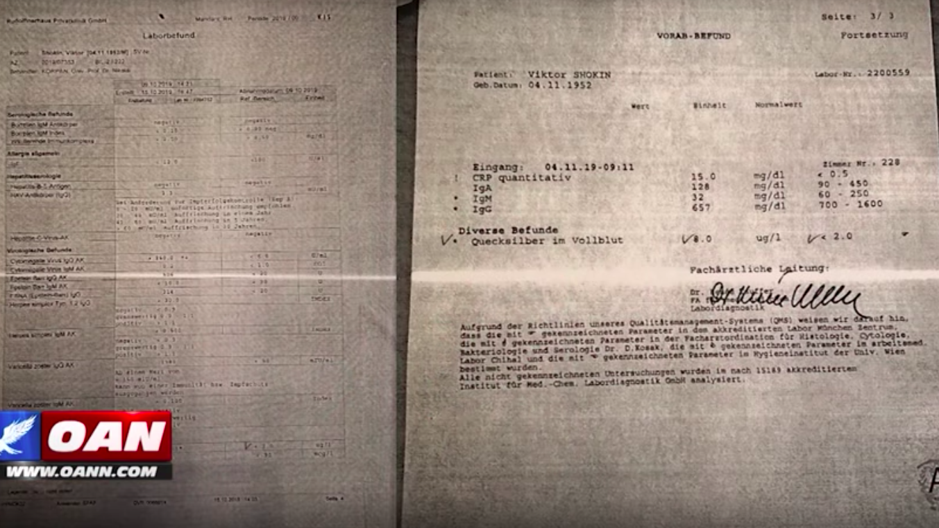 В фильме показали анализы крови Шокина, сделанные в австрийской клинике 4 ноября этого года, согласно которы уровень ртути превышен в несколько раз. Фото: OAN