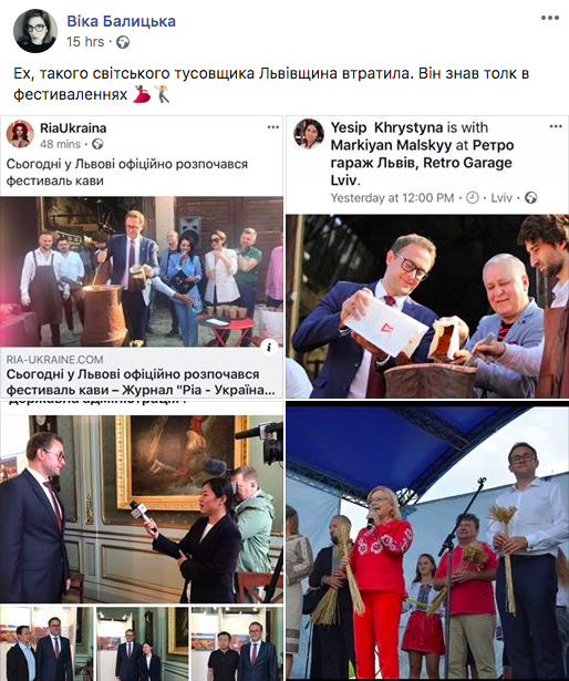 "Эх, такого светского тусовщика Льовщина потеряла. Он знал толк в "фестивалиниях", - иронизирует в Facebook львовская журналистка Вика Балицкая, подкрепляя пост фото с Мальским на открытии "фестиваля кавы", в ретро-гараже, Дворце Потоцких и на сцене со снопиком сена на одном из сельских праздников.