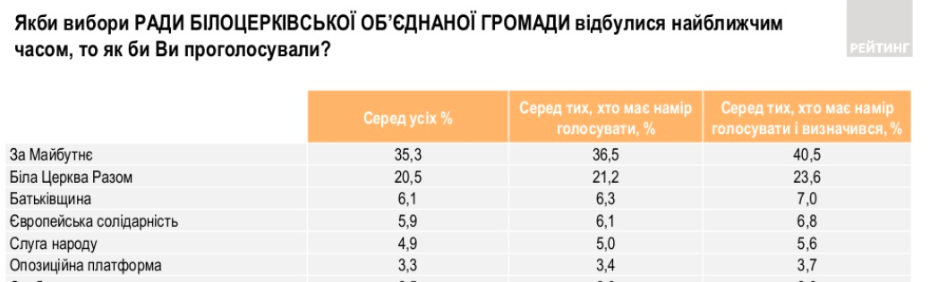 В отдельных регионах ЗБ вообще заняла первое место в списке партий. Например, согласно опросу все той же группы "Рейтинг", в Белоцерковской объединенной территориальной общине поддерживают ЗБ более 40% респондентов.