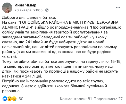 В Киеве уже разразился скандал с одним из самых популярных лицеев – "Голосеевским" №241. Поступление в этот лицей в предыдущие годы сопровождалось большим ажиотажем. На форумах можно прочесть даже о том, что люди нарочно покупали жилье на территории обслуживания этого учебного заведения, чтобы зарегистрировать там детей и таким образом гарантировать им поступление в этот лицей.