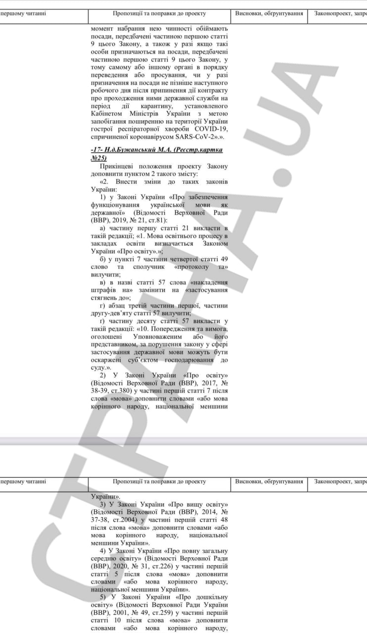 В нашем распоряжении оказалась сравнительная таблица к этому законопроекту. Если указанные в ней "языковые" правки примут, закон о тотальной украинизации ждут серьезнейшие, можно сказать, судьбоносные изменения.