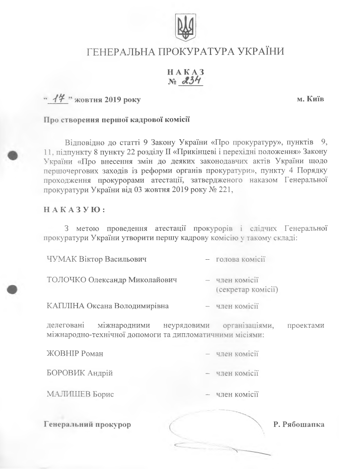 Генпрокурор Руслан Рябошапка своим приказом № 233 от 17 октября 2019 года утвердил Порядок работы кадровых комиссий прокуратуры. Его пунктом 3 предусмотрено, что кадровые комиссии прокуратуры образуются в составе шести человек, из которых не менее трех – лица, делегированные международными неправительственными организациями, проектами международной технической помощи, дипломатическими миссиями.