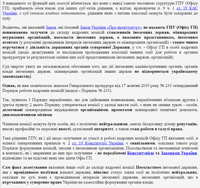 Суд постановил, что привлечение к работе кадровых комиссий указанных лиц является произволом, поскольку такого рода отношения с организациями, посольствами и иностранными агентами, как и обращение к ним, не предусмотрены Конституцией и законами Украины.