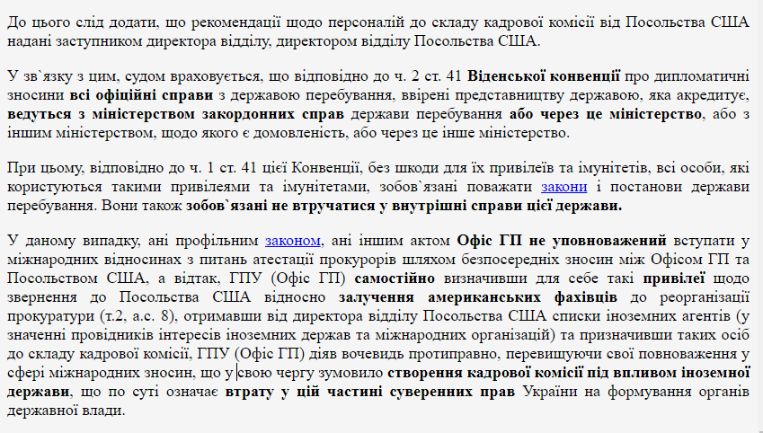 Кроме того, по мнению суда, факт делегирования представителей иностранного посольства в кадровую комиссию прокуратуры нарушает принцип политической нейтральности. Вдобавок адвокат истца заявил в суде, что посольство США, выдвигая кандидатов в члены кадровой комиссии, вмешивается во внутренние дела Украины. А суд установил, что Офис ГП не был уполномочен вступать в международные отношения по вопросам аттестации прокуроров.