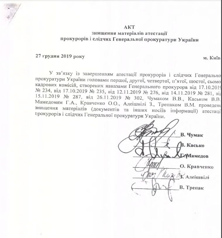Документ подписали главы всех шести кадровых комиссий генпрокуратуры: Виктор Чумак, Виталий Касько, Гюндуз Мамедов, Ольга Кравченко, Зураб Адеишвили, Виктор Трепак: