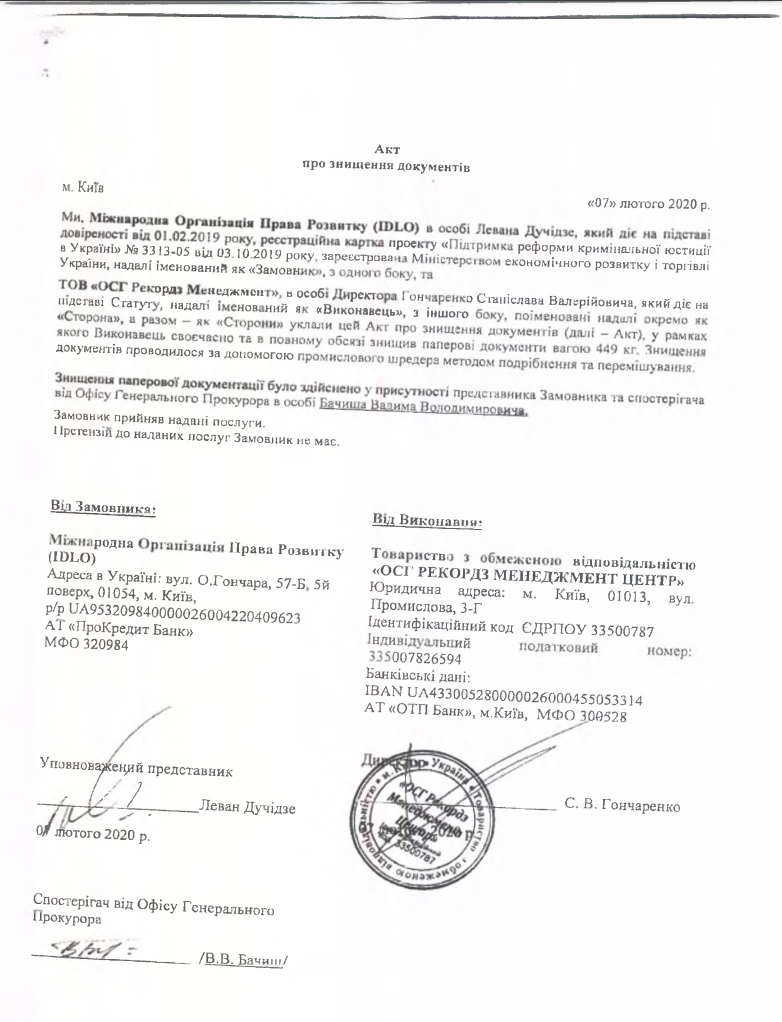 В нем сказано, что уничтожение документов весом 449 кг проведено при помощи промышленного шредера. Заказчиком уничтожения выступила некая "Международная организация права развития", а наблюдал за процессом представитель Офиса генпрокурора Вадим Бачиш: