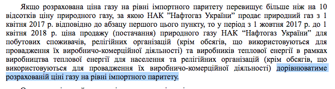 В постановлении говорится, если цена газа, по которой "Нафтогаз Украины" реализовывает добытый в Украине газ для населения и теплокоммунэнерго, не отличается от импортного паритета в пределах до 10%, то она остается на предыдущем уровне. Если же выше 10%, то цена газа должна быть повышена до уровня цены импортного паритета.