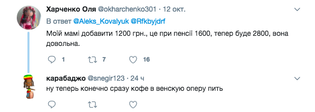— Такая теперь у вас будет пенсия, Вы счастливы? —  оператор Пенсионного фонда спрашивает у пенсионерки из Харькова, получившей доплату в сумме 897,76 гривен к своей 1626 гривнам, звонящей на горячую линию Пенсионного фонда.