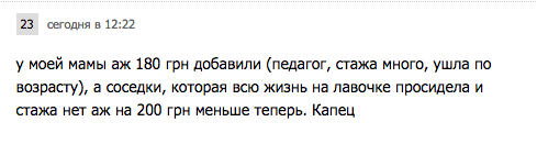 Например, пенсионерка Галина Ивановна, проработавшая 35 лет на заводе железобетонных конструкций к своей пенсии получила прибавку 220 гривен. А ее соседка Анна Васильевна с 40-летним стажем удостоилась повышения на 241 гривну - с 1619 до 1860.