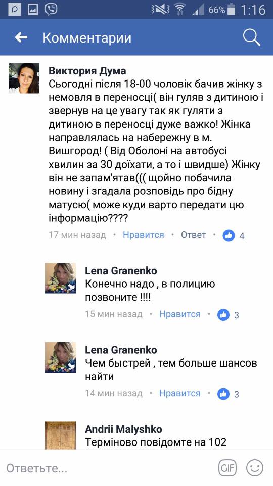 Впрочем, даже эта информация не помогла идентифицировать преступницу. Задержать ее по "горячим следам" не удалось. В то же время, комментарий одной из пользовательниц соцсети о том, что около 18:00 пятницы ее супруг видел девушку с сиреневой переносной корзиной для младенца в Вышгороде, дал толчок к детализации местонахождения злоумышленников.