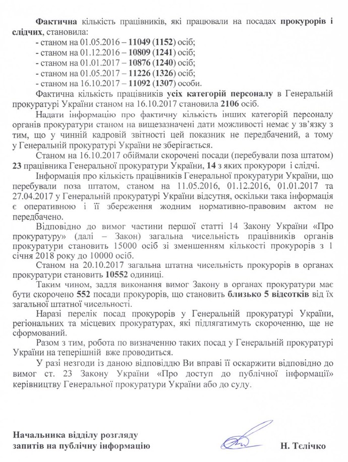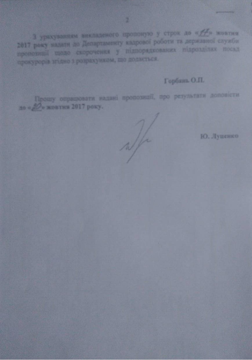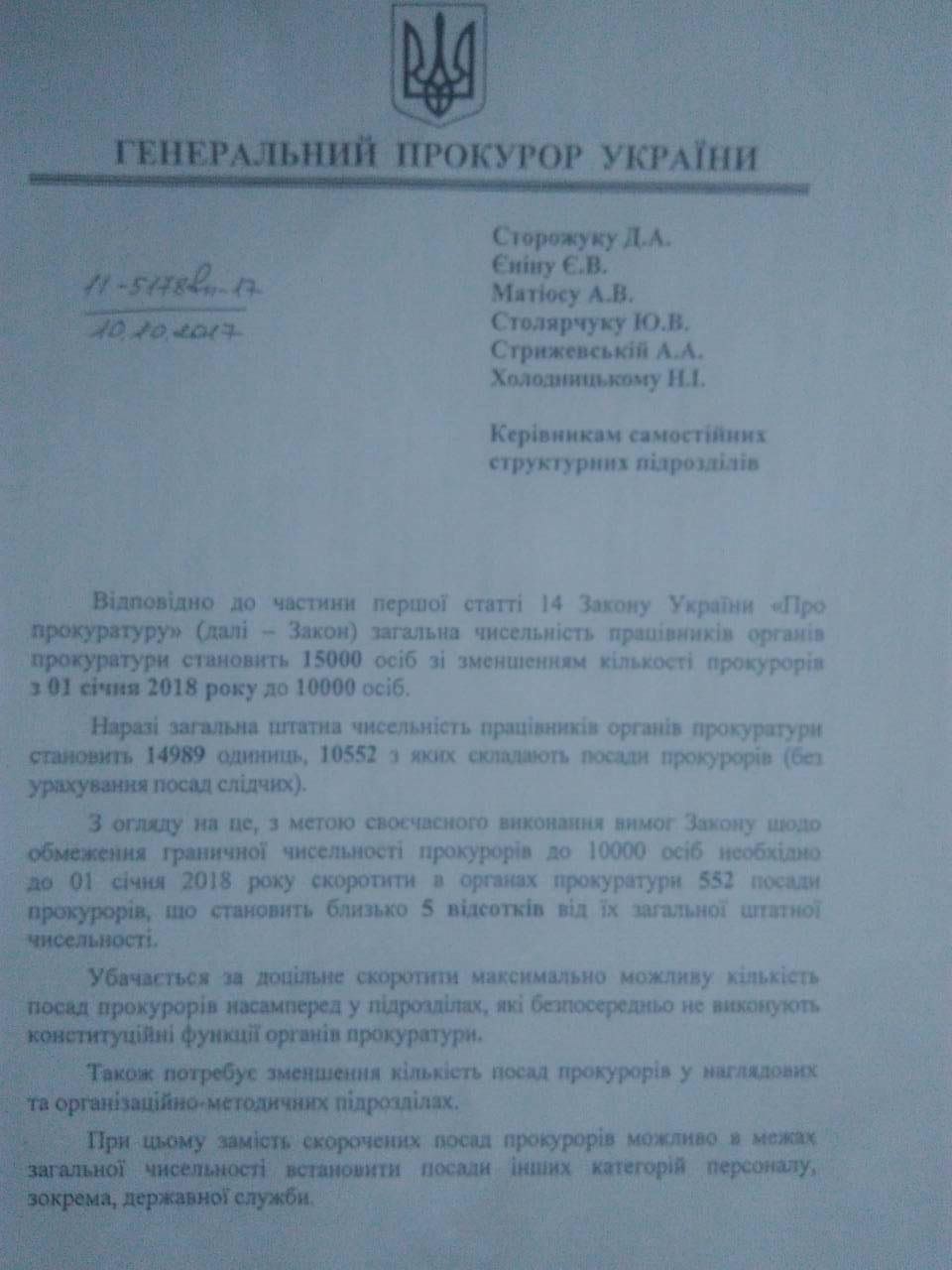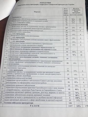 Три недели назад по структуре ведомства было запущено письмо, подписанное генпрокурором Юрием Луценко. В этом документе фигурирует проект расчета новой штатной численности центрального аппарата ведомства.