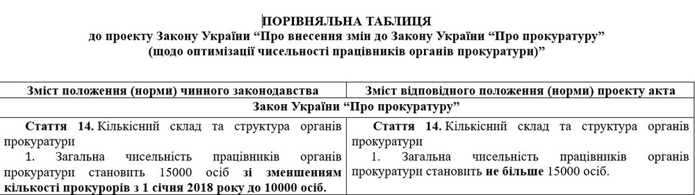 Нардепы предлагают убрать этот императив из закона. И ограничиться формулировкой о том, что общая численность Генпрокуратуры, включая процкеров, "следаков" и прочие вспомогательные единицы не должна выходить за пределы пресловутых 15 тысяч. И фактически, заморозить ситуацию на ее текущем уровне.