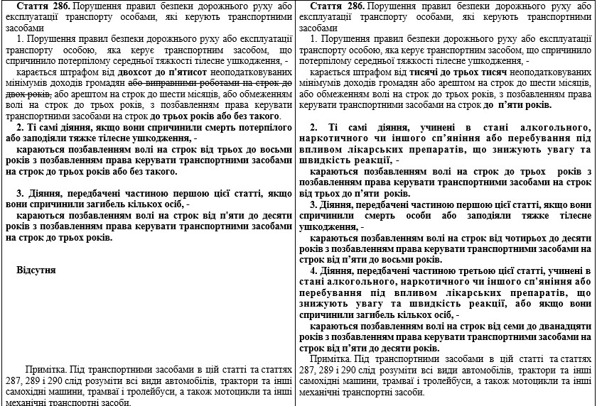 В-пятых, предлагается внесение изменений в ст. 55 и ст.286 УК Украины для ужесточения ответственности за нарушения правил дорожного движения, которые повлекли травмы или гибель людей.
