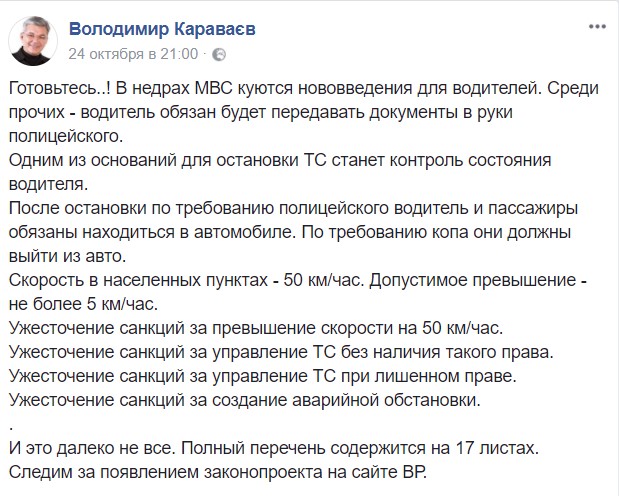 Уже через неделю стали известны первые детали планируемых новшеств. Заместитель председателя Координационного совета Общенационального форума дорожного движения Владимир Караваев на своей странице в Facebook проинформировал, что именно приготовили для водителей в недрах МВД.