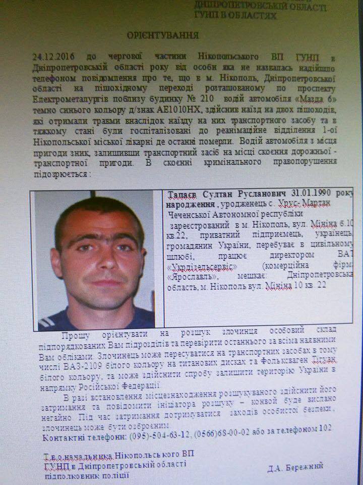 Ориентировка на Султана Тапаева, источник фото nikopolnews.net