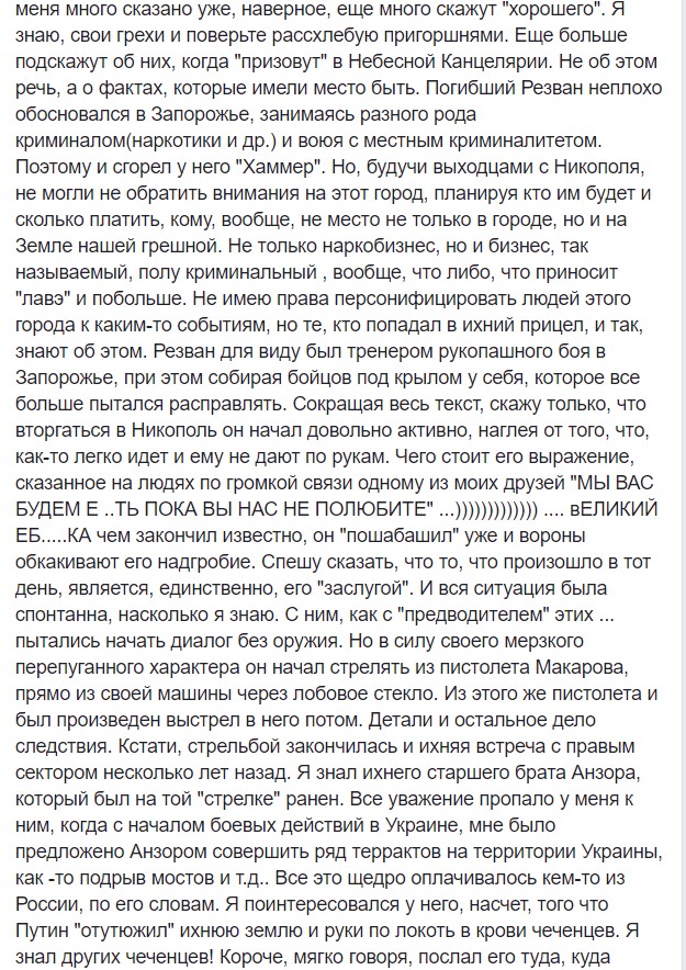 По его словам, Ризван Тапаев в Запорожье занимался разного рода криминалом, включая распространение наркотиков. А затем решил взять под свой протекторат провинциальный городок на Днепропетровщине