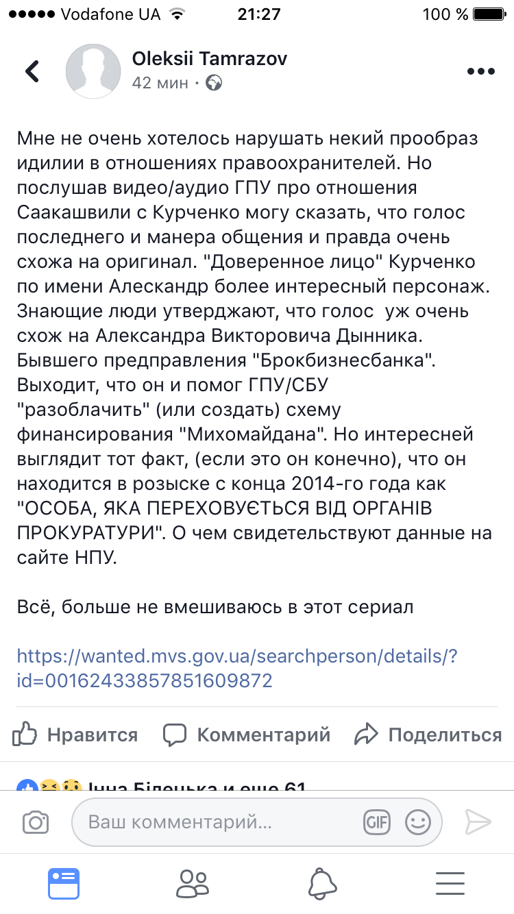 Как считает журналист Алексей Тамразов, "Саша", с которым общался и Дангазде, и Саакашвили по телефону - это близкий к Курченко экс-глава правления Брокбизнесбанка Александр Дынник (с 2014 года проживавший в Москве). Учетная карточка которого, по подозрению в причастности к деятельности беглого олигарха, уже три года активирована на сайте МВД.