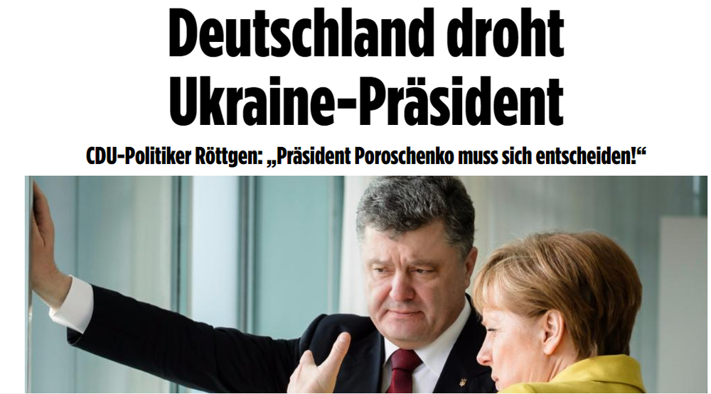 "Федеральное правительство и Комиссия ЕС, по информации Bild, угрожают Украине прекращением выплат финансовой помощи. В центре критики – президент Украины Петр Порошенко", – отмечает корреспондент издания.