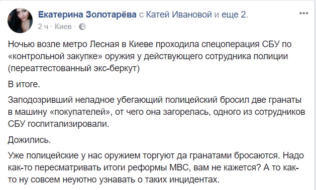 "Сотрудники СБУ... проводили контрольную закупку боеприпасов у старшины роты батальона полиции особого назначения ГУНП в Киевской области. Во время задержания тот оказал сопротивление и бросил гранату в автомобиль Toyota Camry, в котором находились эсбэушники", – сообщил причины бойни собеседник журналистов.