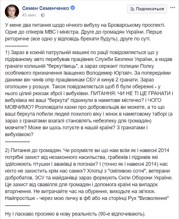 В частности, нардеп Семенченко задается вопросом: не является ли брошенная в эсбэушников накануне граната РГД из той же партии боеприпасов, которые якобы обнаружили сотрудники МВД во время сноса палаточного городка МихоМайдана под Верховной Радой?
